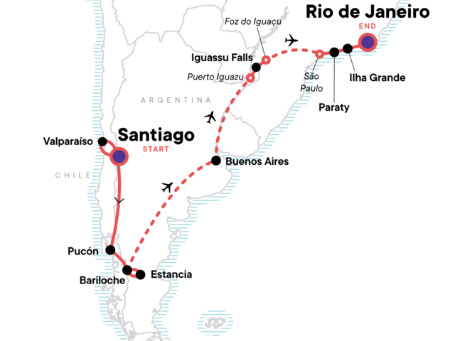 Your Discover Moment: Ilha Grande. City tour of Santiago. Driving through the Seven Lakes district. Estancia visit and barbecue lunch (full-day). Iguassu Falls visit (Brazil and Argentina). Local flights. All transport between destinations and to/from included activities.
