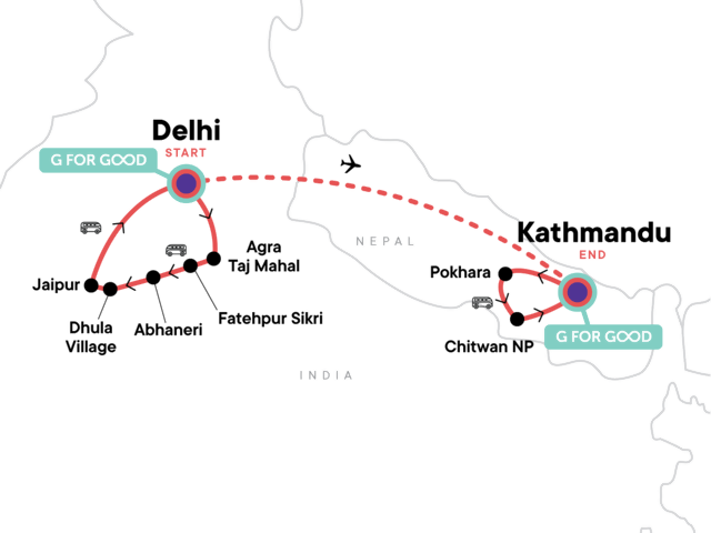 Wander around modern and ancient Delhi, Revel in the magnificence of the Taj Mahal, Visit rural villages and historic forts, Explore India's vibrant cities and explore the sights in old Kathmandu and Bhaktapur, Marvel at the mountain landscapes